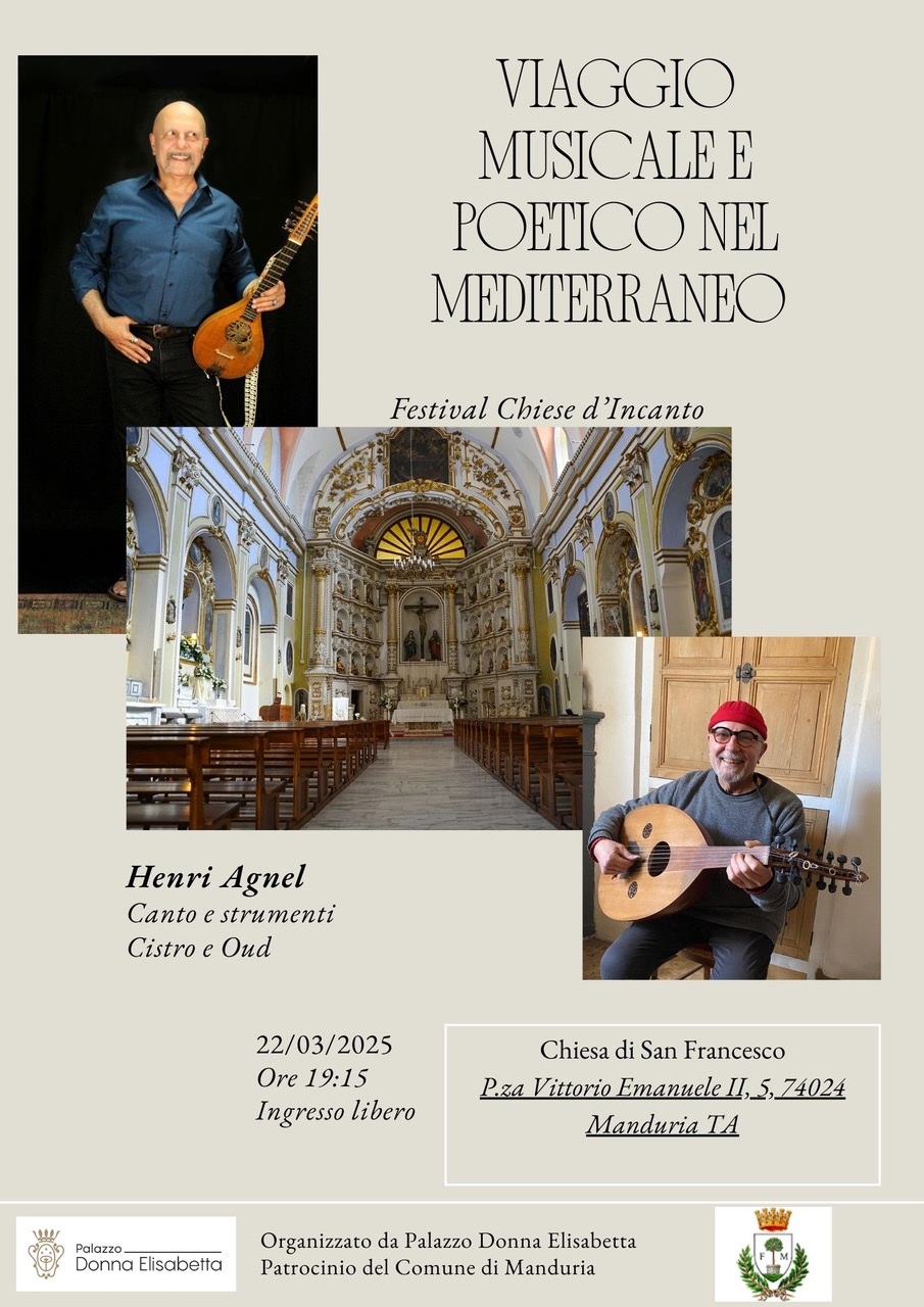 Sabato 22 marzo a partire dalle ore 19:00 si terrà presso la Chiesa di San Francesco l'evento Musicale "Viaggio musicale poetico nel Mediterraneo" organizzato da Palazzo Donna Elisabetta con il Patrocinio e la collaborazione del 'l'Assessorato alla Cultura del Comune di Manduria.